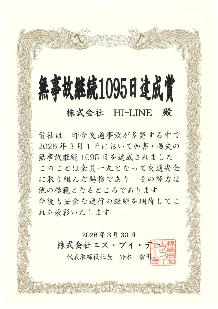2026年3月2日、常温山口センターで無事故継続1095日達成(2026年2月28日時点)の表彰式が執り行われました。